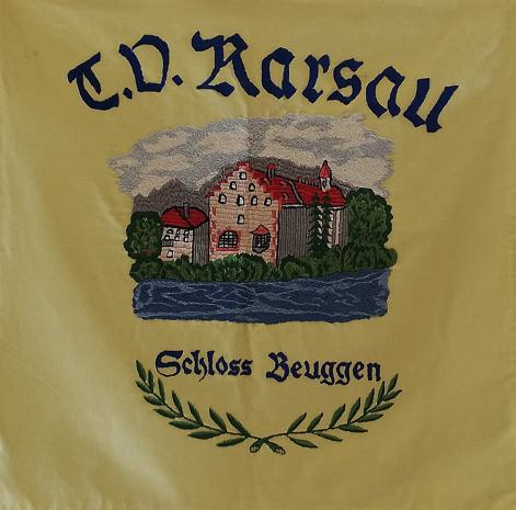 Im Stadion standen einige tausend Fahnen, Farbenpracht und Stimmung sind kaum zu erahnen. Dann wurden sie ins Messegelände transportiert, und dort zur Besichtigung für jedermann deponiert. Zum Abschluß beim Umzug gingen die Fahnenträger mit Fahnen voraus, es war ein fröhliches Treiben, ein Winken und Rufen, ein Augenschmaus. Müde aber reich mit neuen Eindrücken fuhren wir heim, und hoffen, daß so etwas noch viele Male wird sein. Im Alltagsleben wieder angekommen, wurde die Rückseite dann vorgenommen, die fünf Stickerinnen der Montagsgruppe, arbeiteten fleißig, ganz ohne Lupe, am zweiten Motiv, dem Schloß am Rhein, denn die Fahne sollte bald fertig sein. Füttern und schmücken mit Fransen, war das Ende des Ganzen, dies wurde von Rita noch gemacht, und sie hat sie uns heute mitgebracht. Die Fahne wurde erstmals fertig zur Generalversammlung am 30.01.1988 und von Rita Bär mit diesem Text präsentiert und die weiteren Stickerinnen waren Christa Kaiser, Helga Lutz, Daniela Vollmer und Emilie Wehrle.